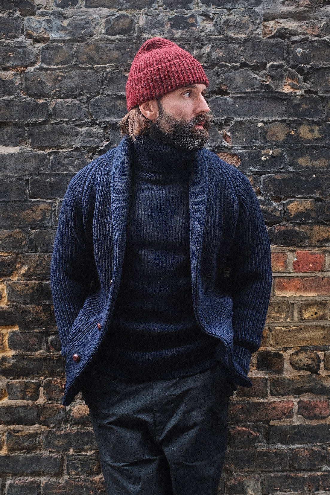 Our version of this iconic piece is made without compromise - Knitted in a thick chunky wool rib, with leather acorn buttons down the front, patch pockets, a high shawl collar that can be flipped up, and a fold back cuff which can be adjusted so the sleeve is not too short.
