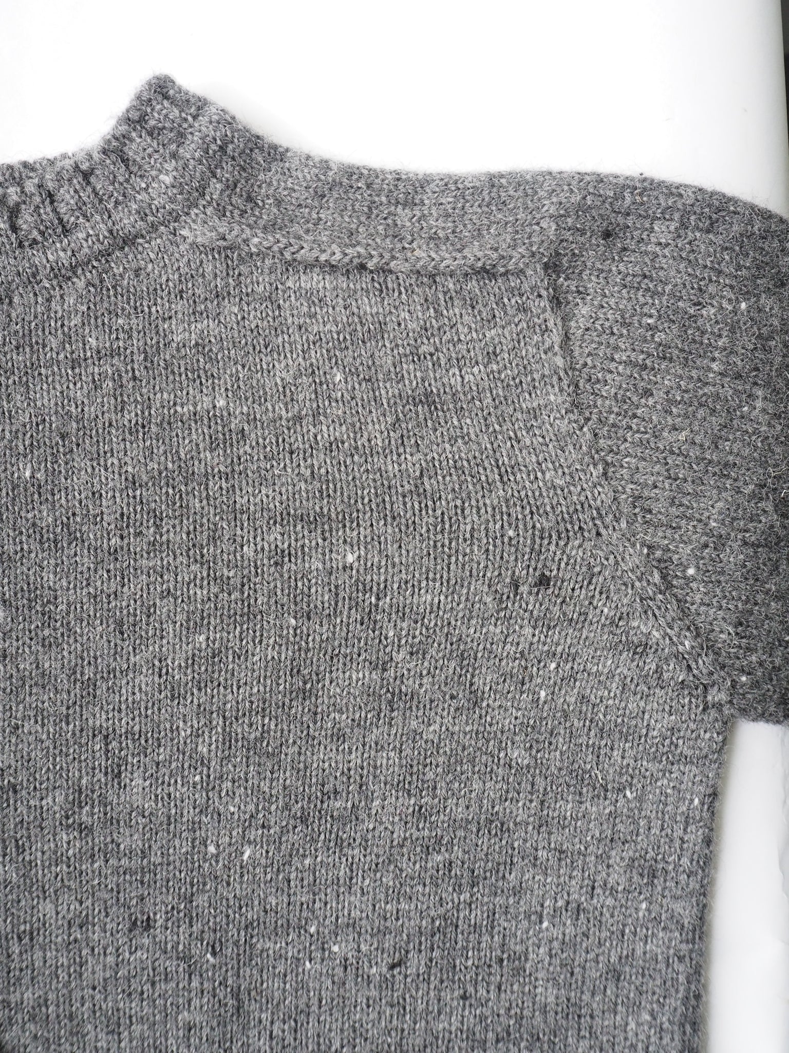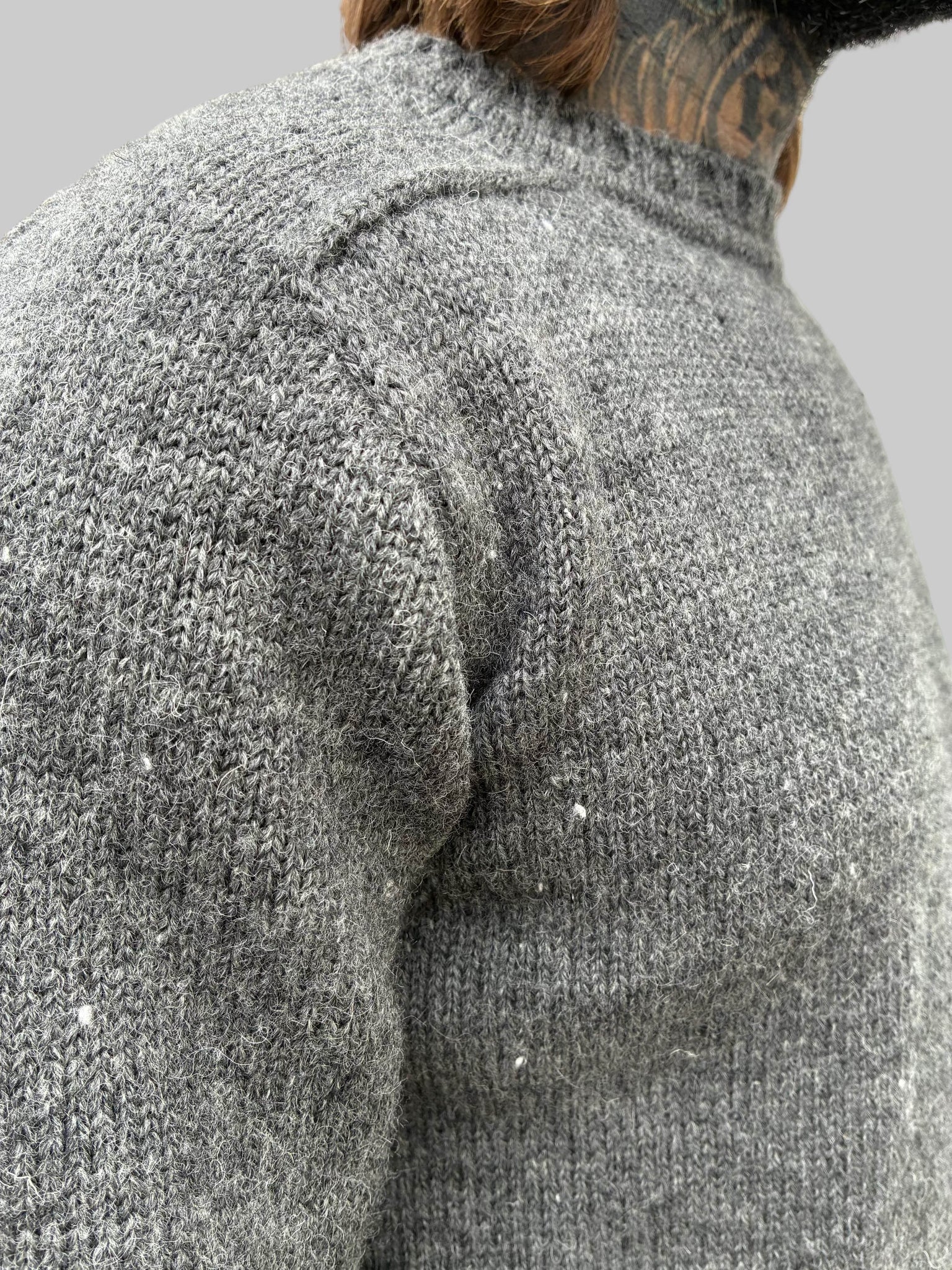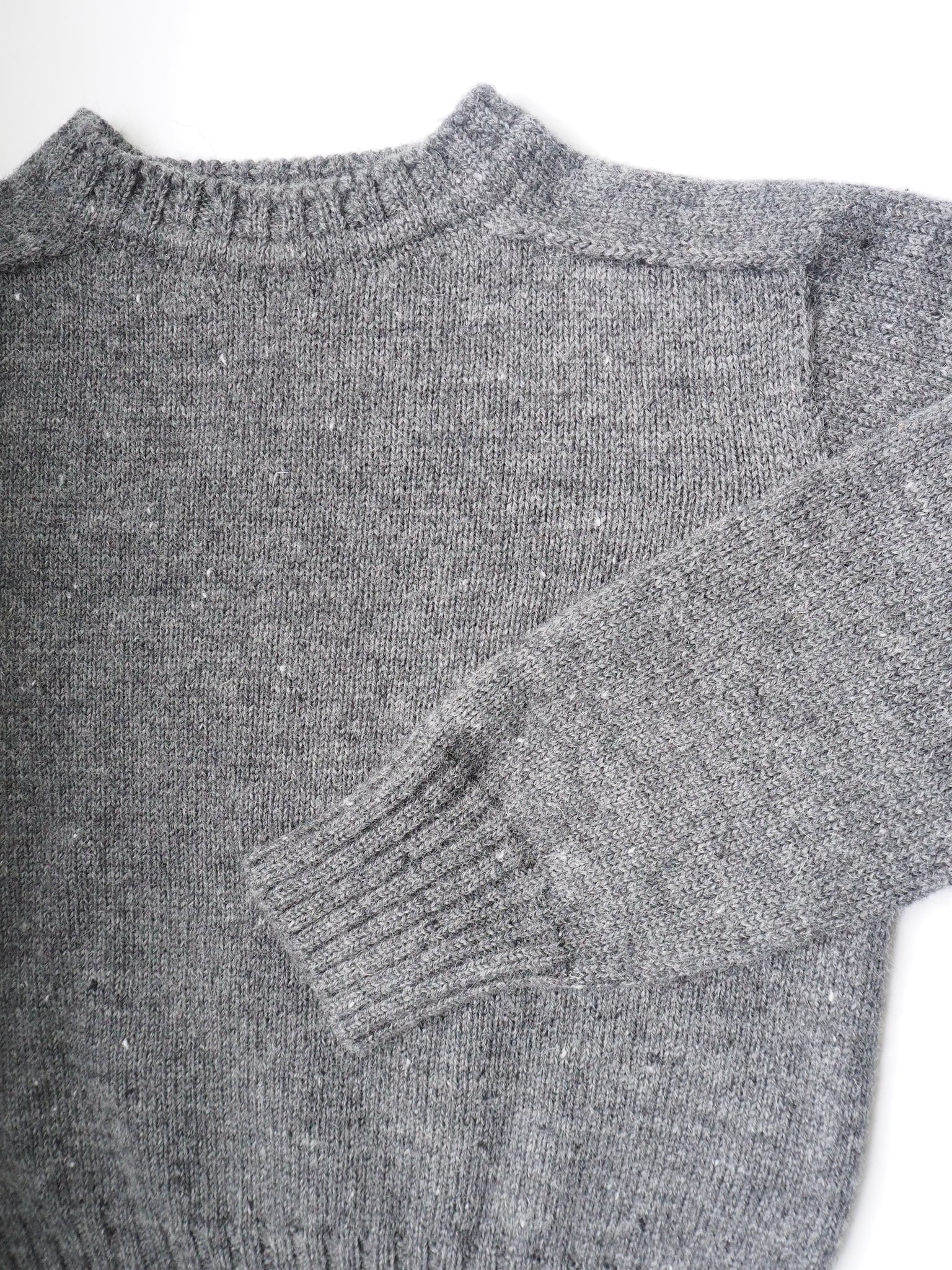 The Mountain Sweater is based on early 20th Century climbing sweaters. Made in a rugged looking Grey Nepp flecked yarn, it is updated in a cropped fit, and has enhanced comfort by using saddle shoulders & no side seams.
