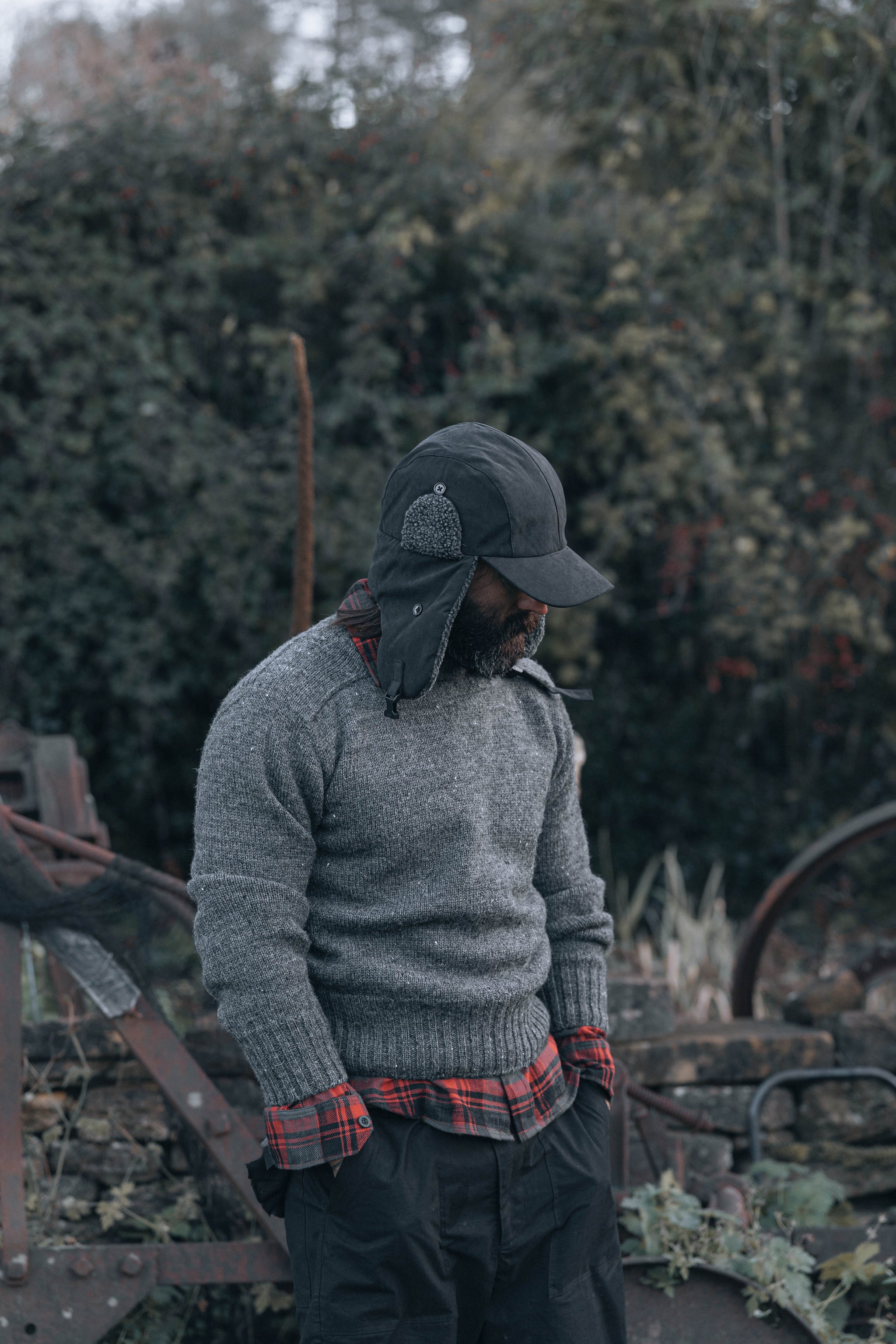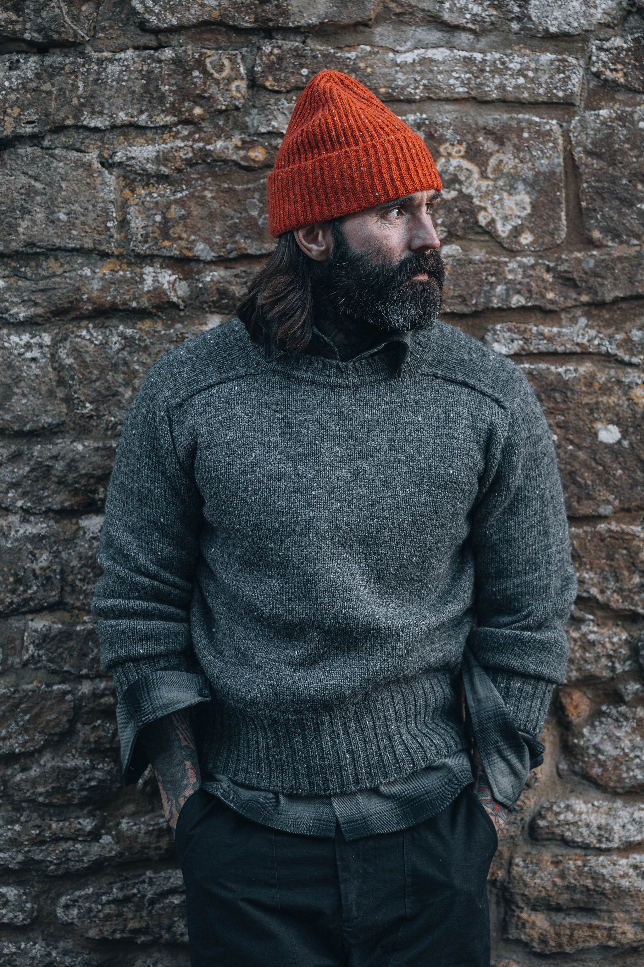 The Mountain Sweater is based on early 20th Century climbing sweaters. Made in a rugged looking Grey Nepp flecked yarn, it is updated in a cropped fit, and has enhanced comfort by using saddle shoulders & no side seams.